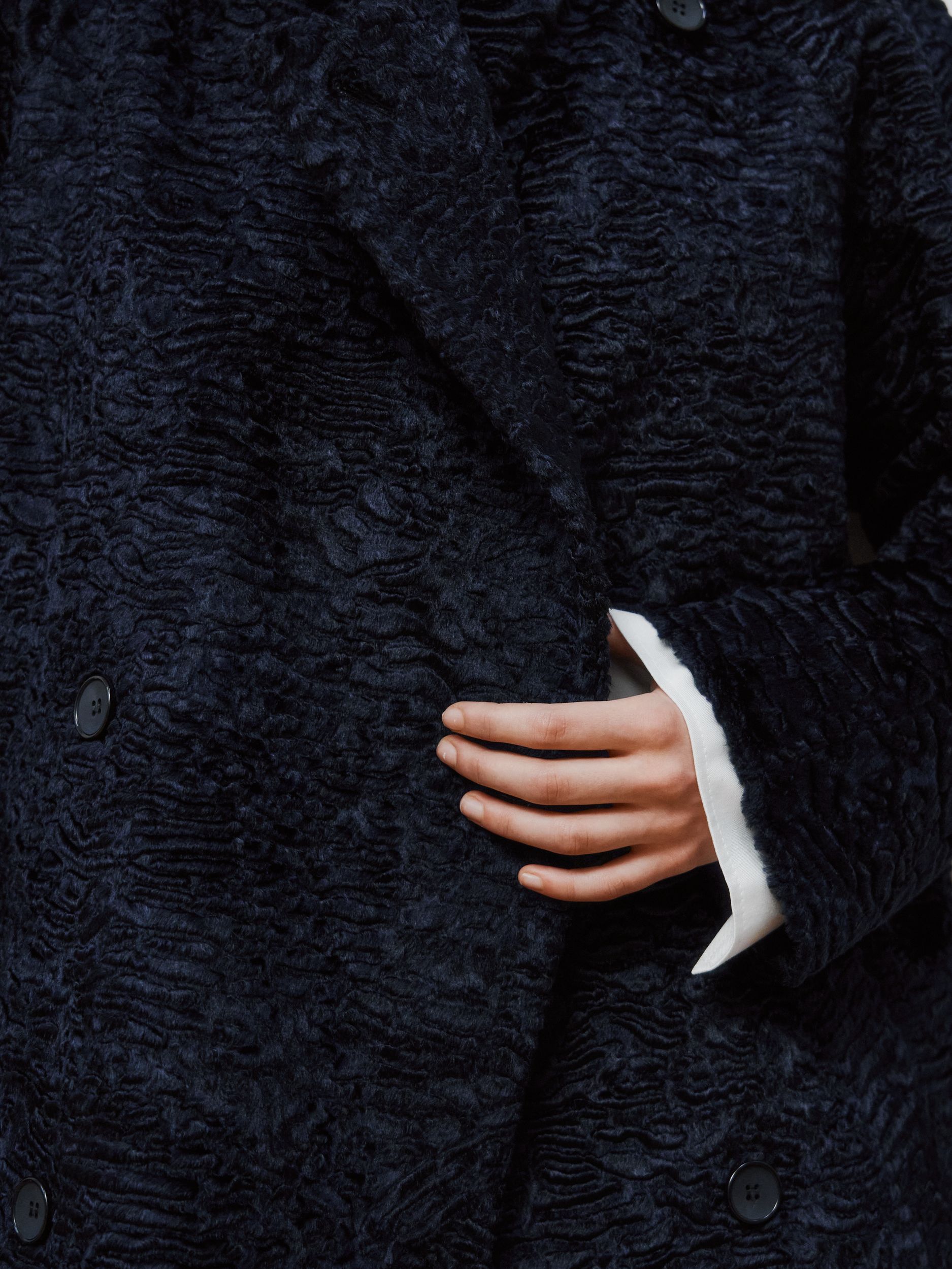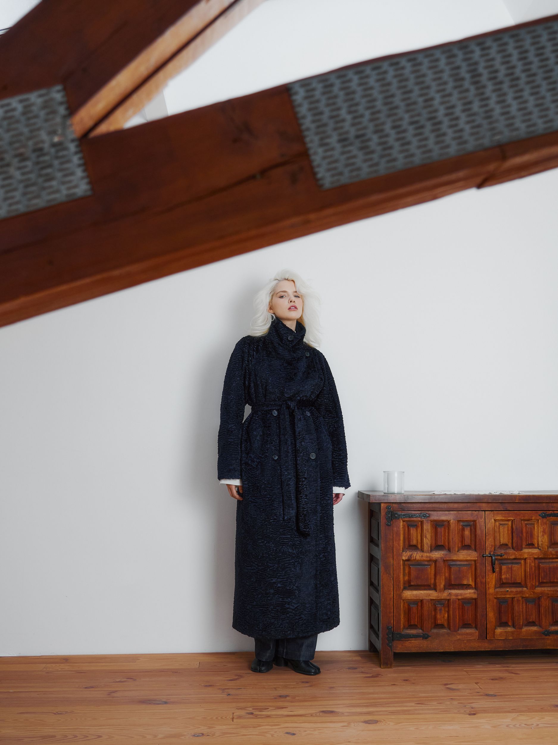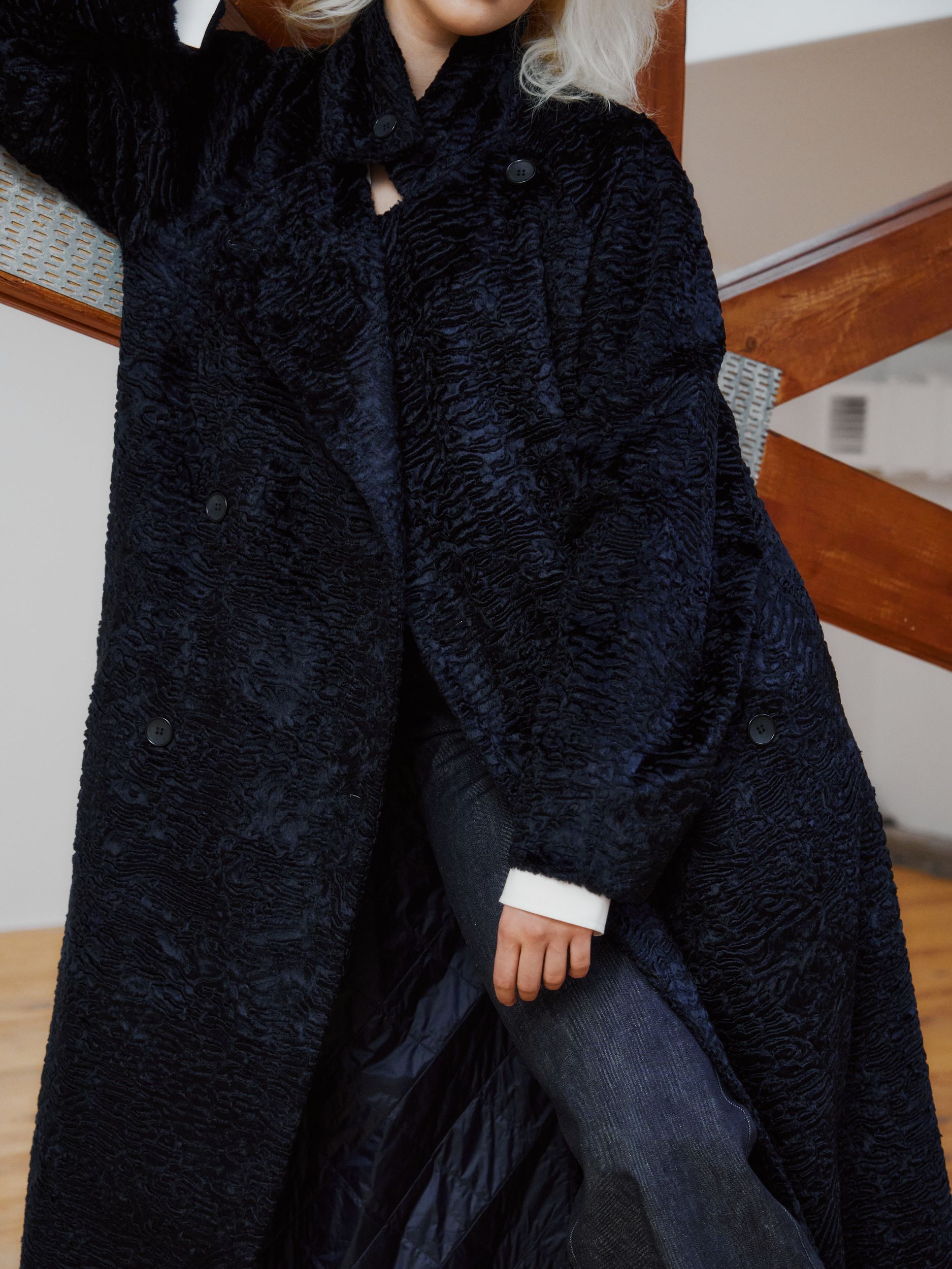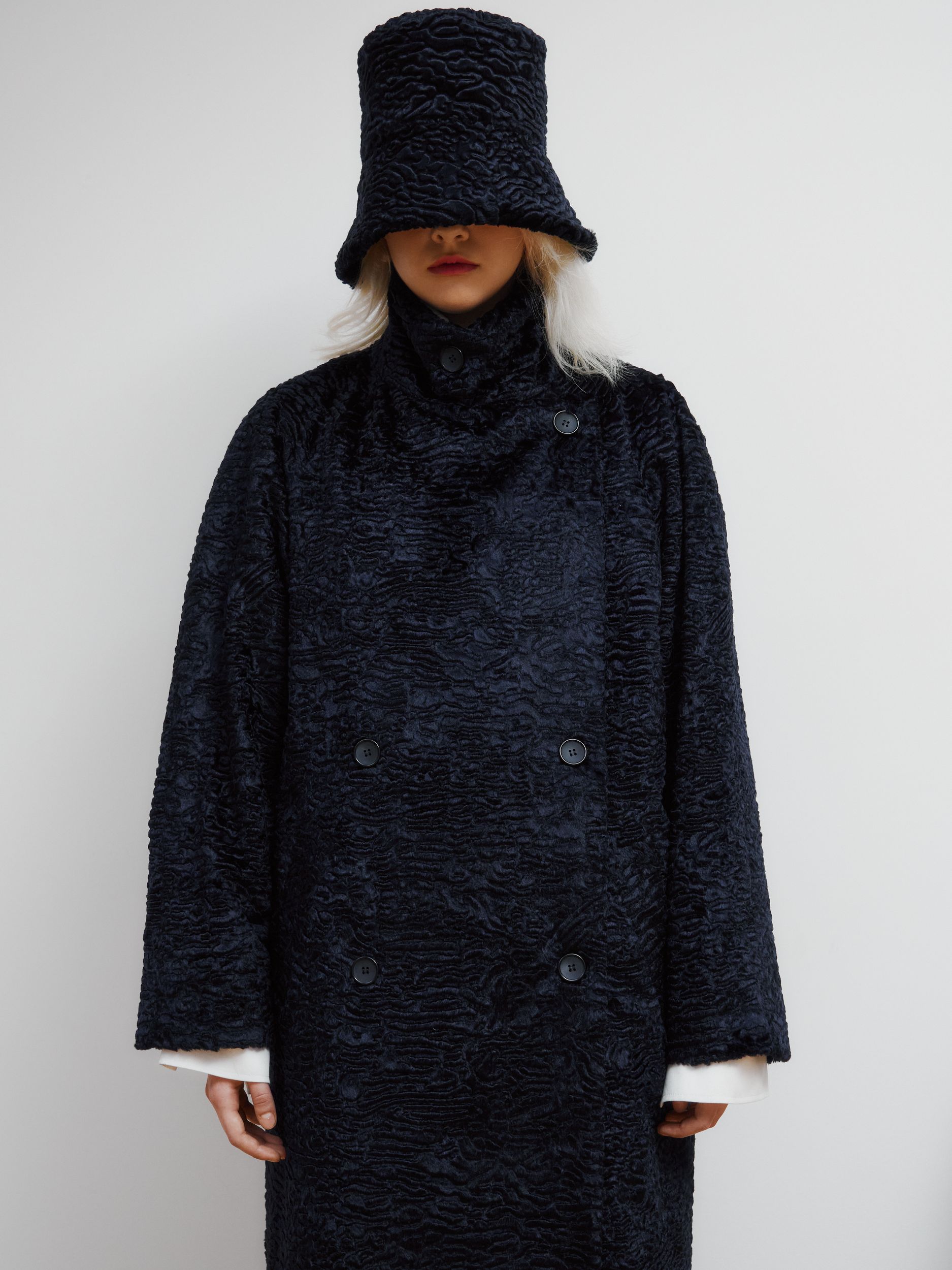 Двубортное пальто в длине макси, выполненное из итальянской шерсти. Ткань имеет красивую фактуру.
