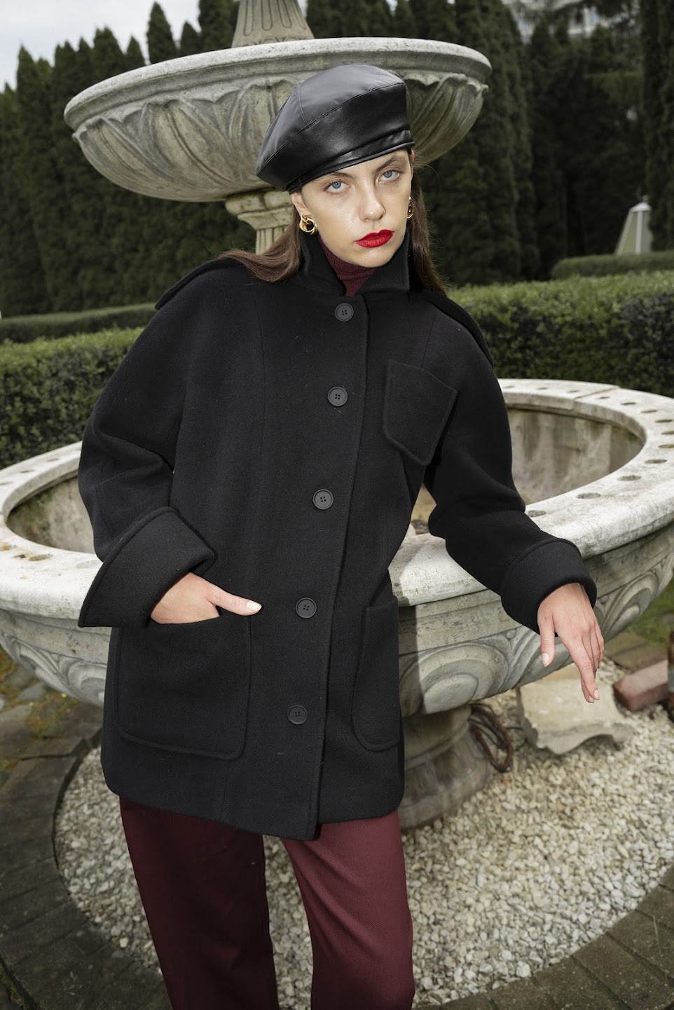 Пальто из итальянской форменной шерстис цельнокроеным рукавом трендовой округлой формы. Декоративные двойные манжеты с отворотом, накладные карманы и прямой силуэт-компромис вечной элегантности и трендов 2025-2026г.