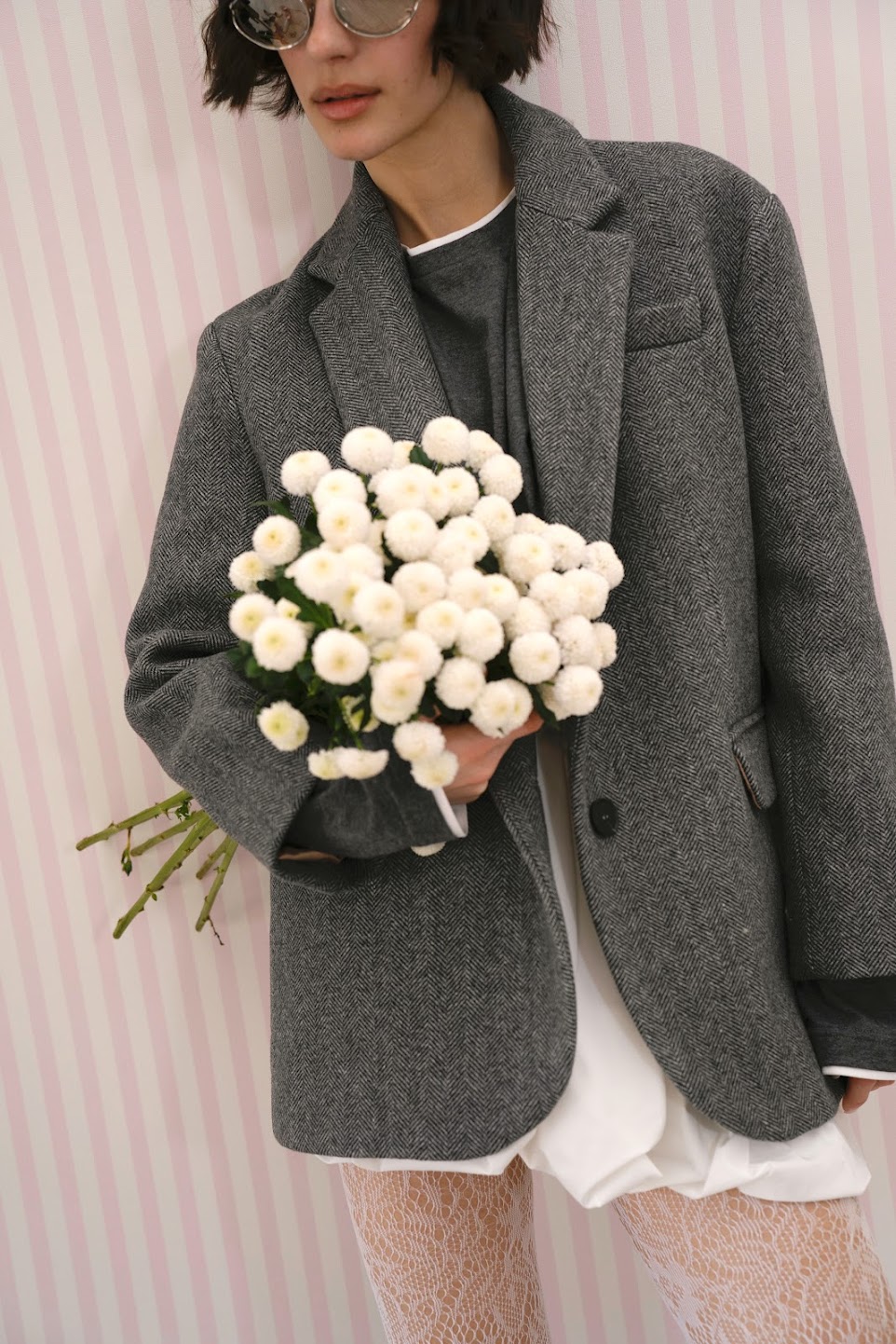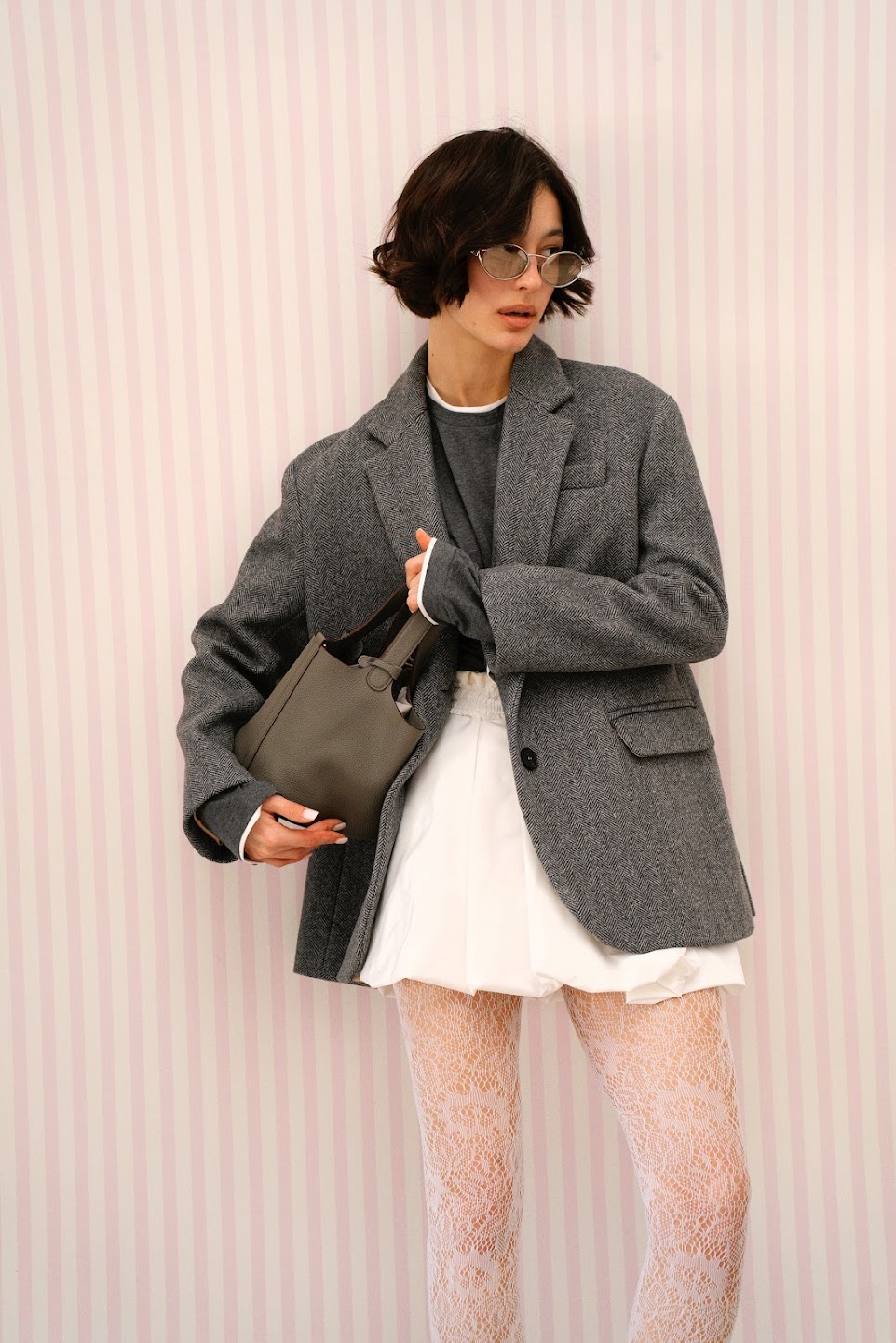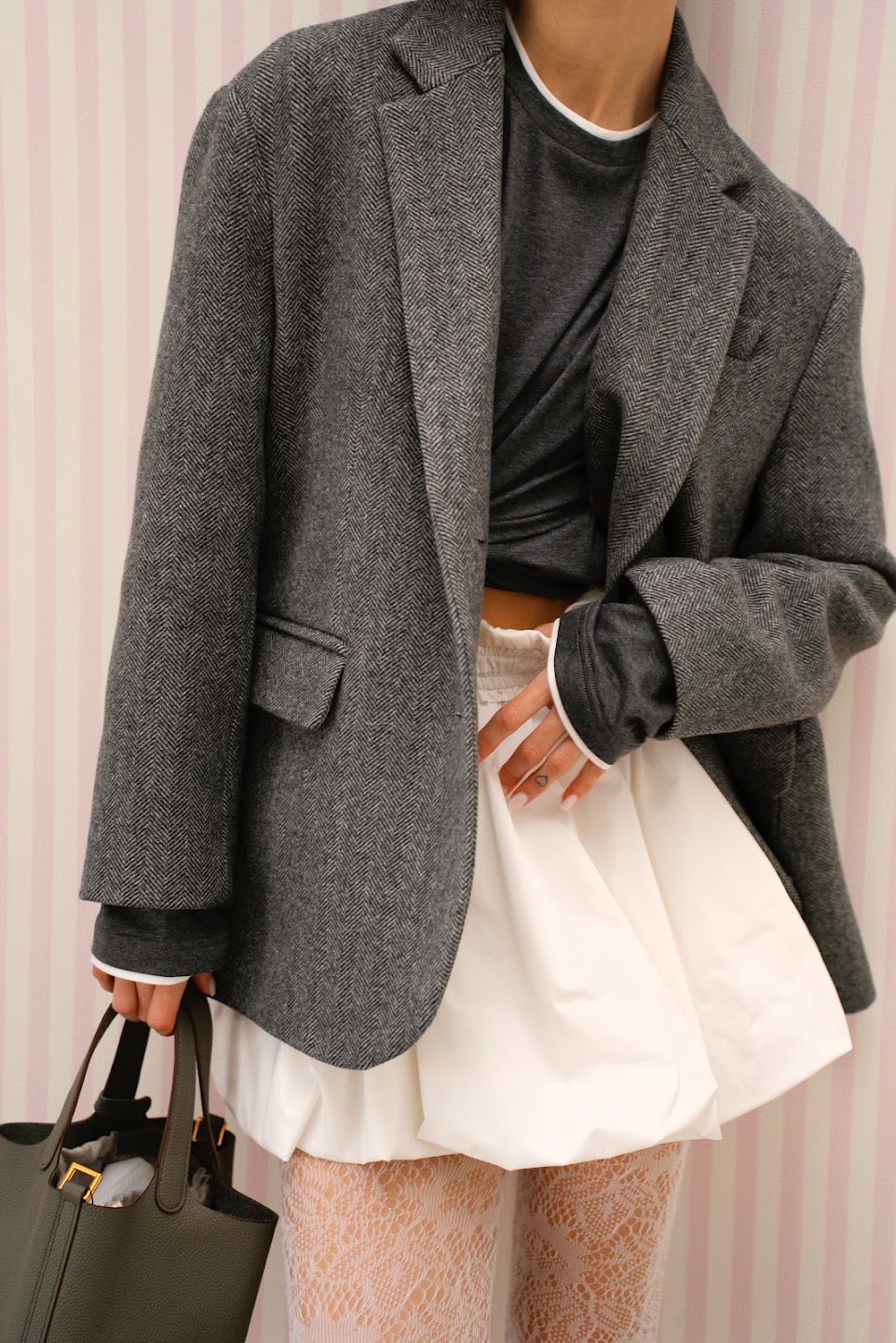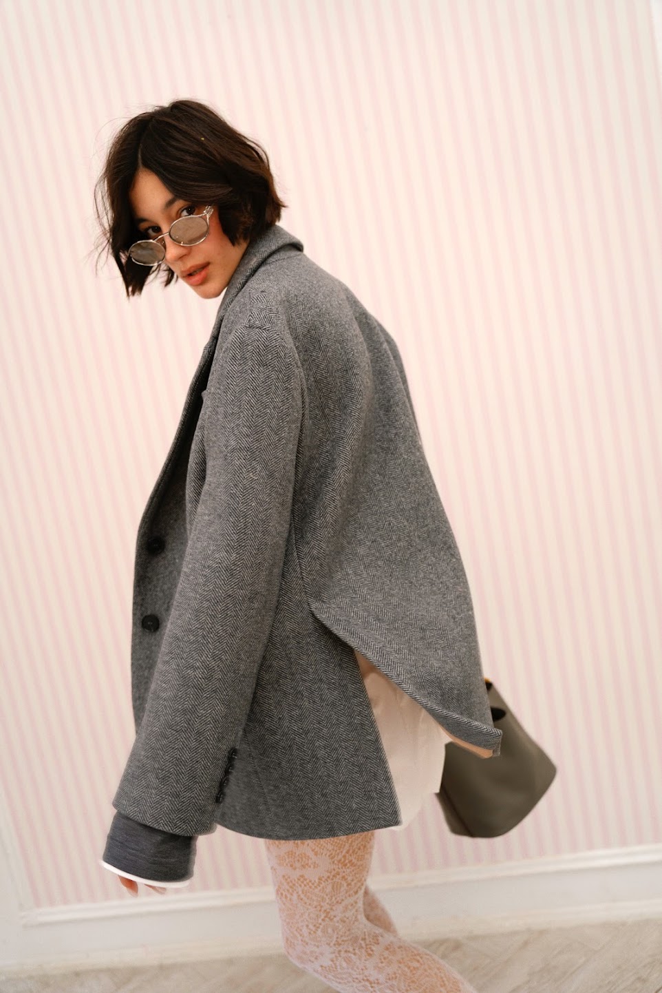 Жакет- полупальто свободного прямого силуэта с мягкой, спущенной линией плеча и двумя шлицами в трендовом принте «елочка» в безупречном графитовом оттенке