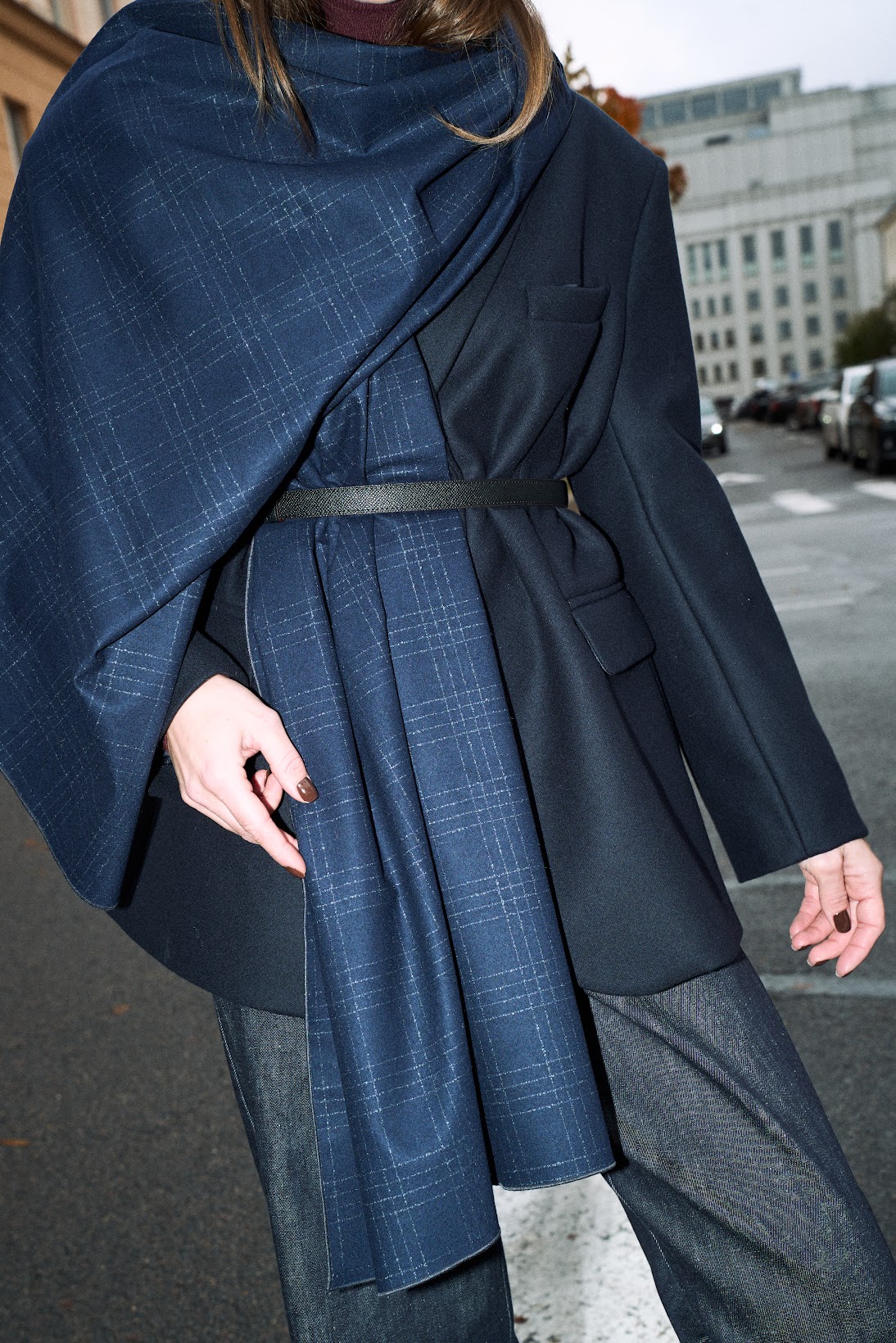 Жакет- полупальто свободного прямого силуэта с мягкой, спущенной линией плеча и двумя шлицами в трендовой фактуре сезона