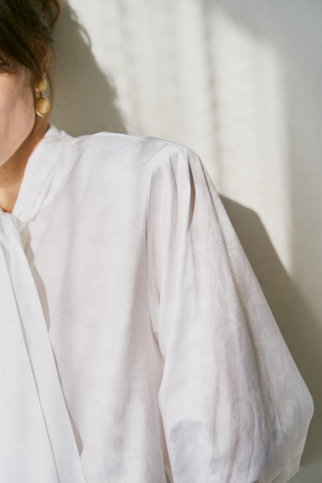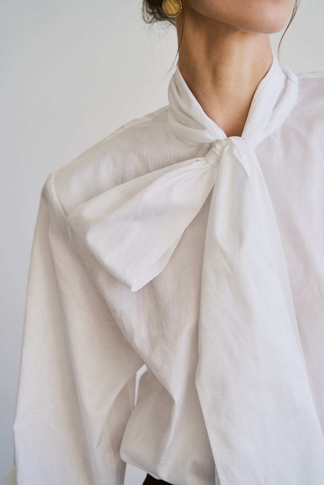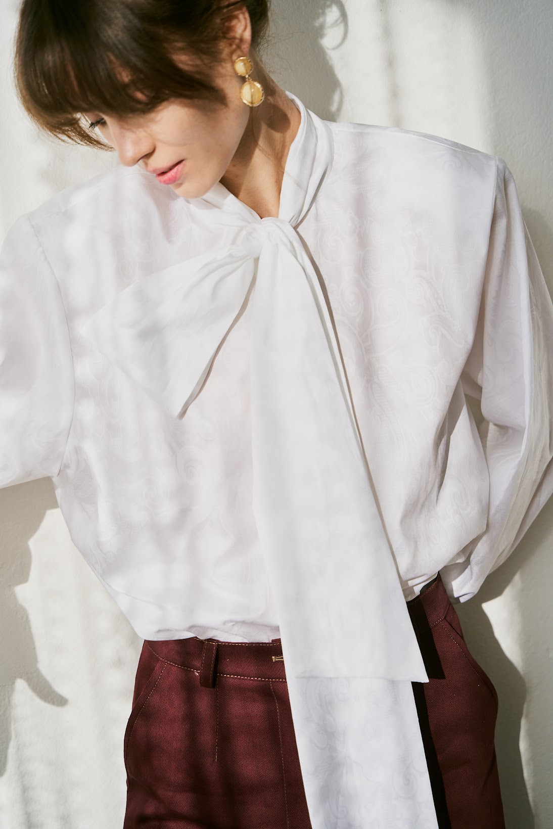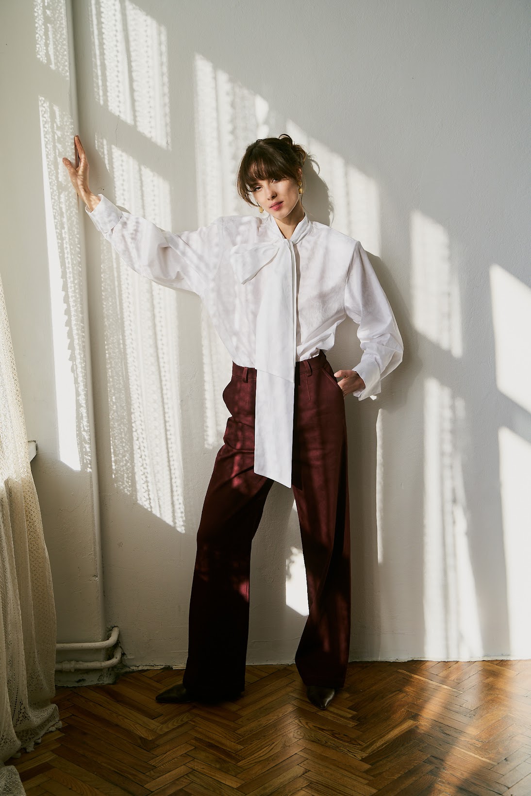 Блуза выполнена из итальянского хлопка и отличается выразительной фактурой. Модель отражает один из ключевых трендов 2026 года - сочетание винтажной эстетики 80-х и современной женственности. Подплечники формируют силуэт «сильной женщины», добавляя объём верхней части и создавая выразительный, уверенный образ.