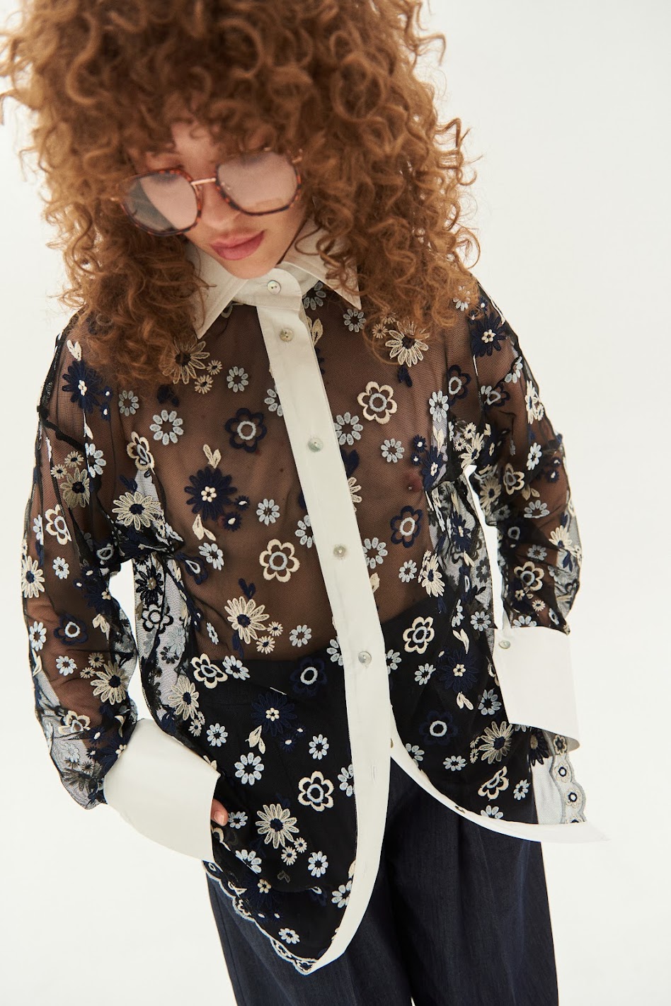 Рубашка свободного силуэта из эксклюзивного итальянского кружева с контрастными белыми манжетами и воротником .
