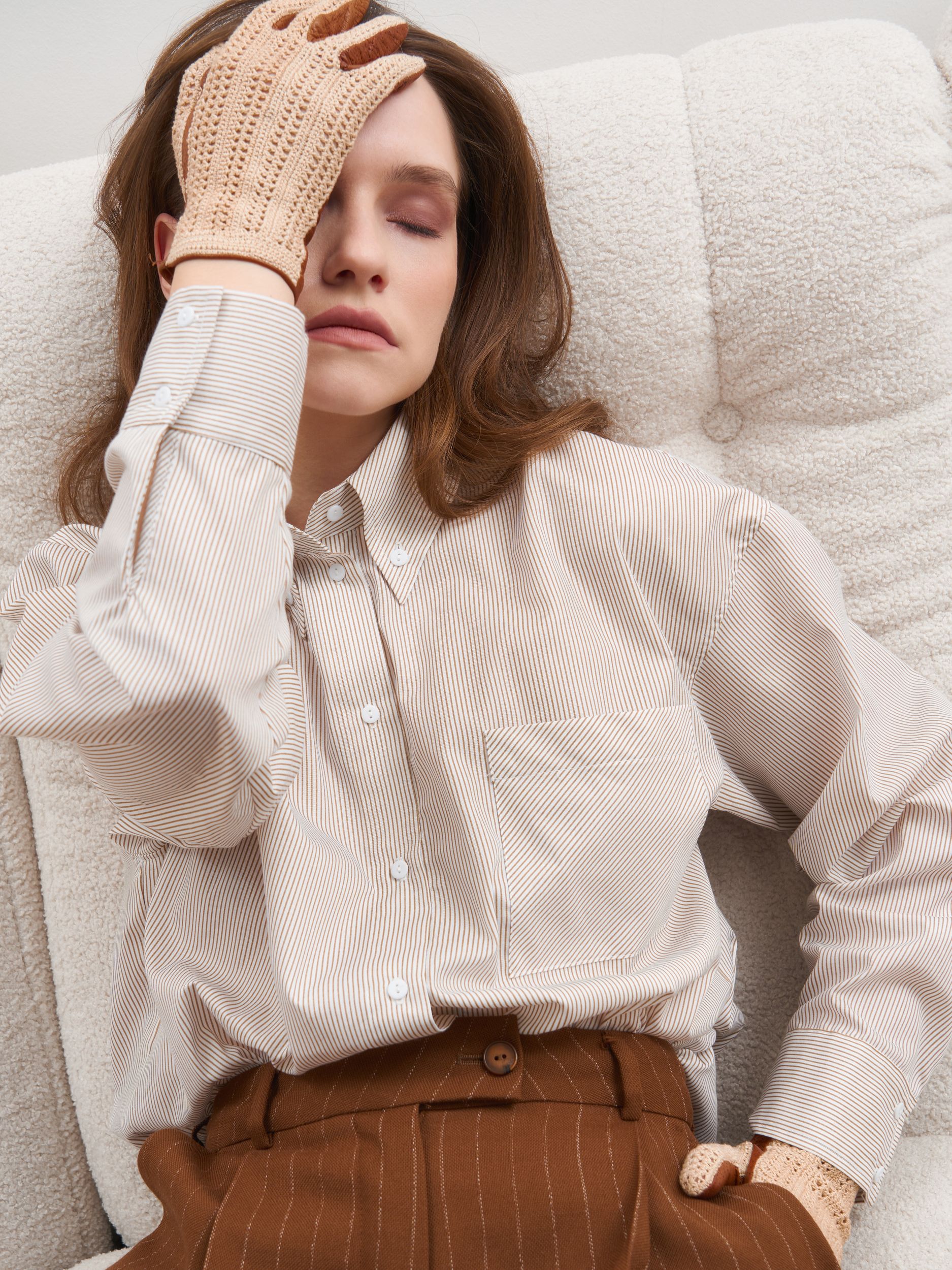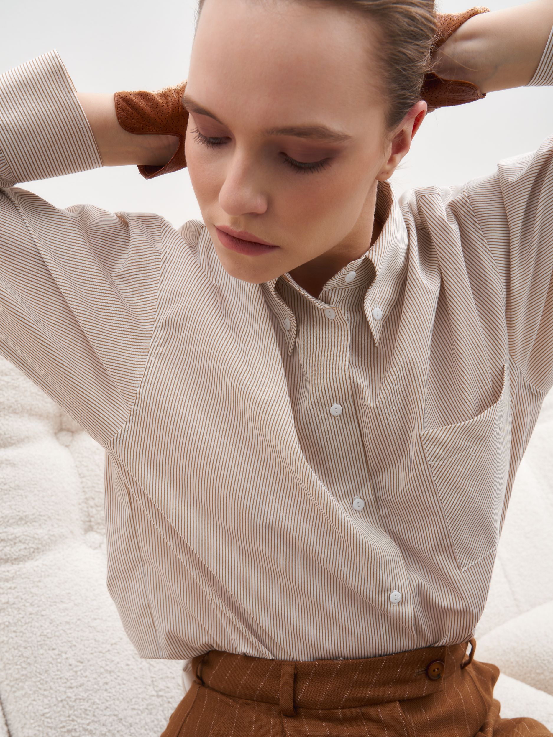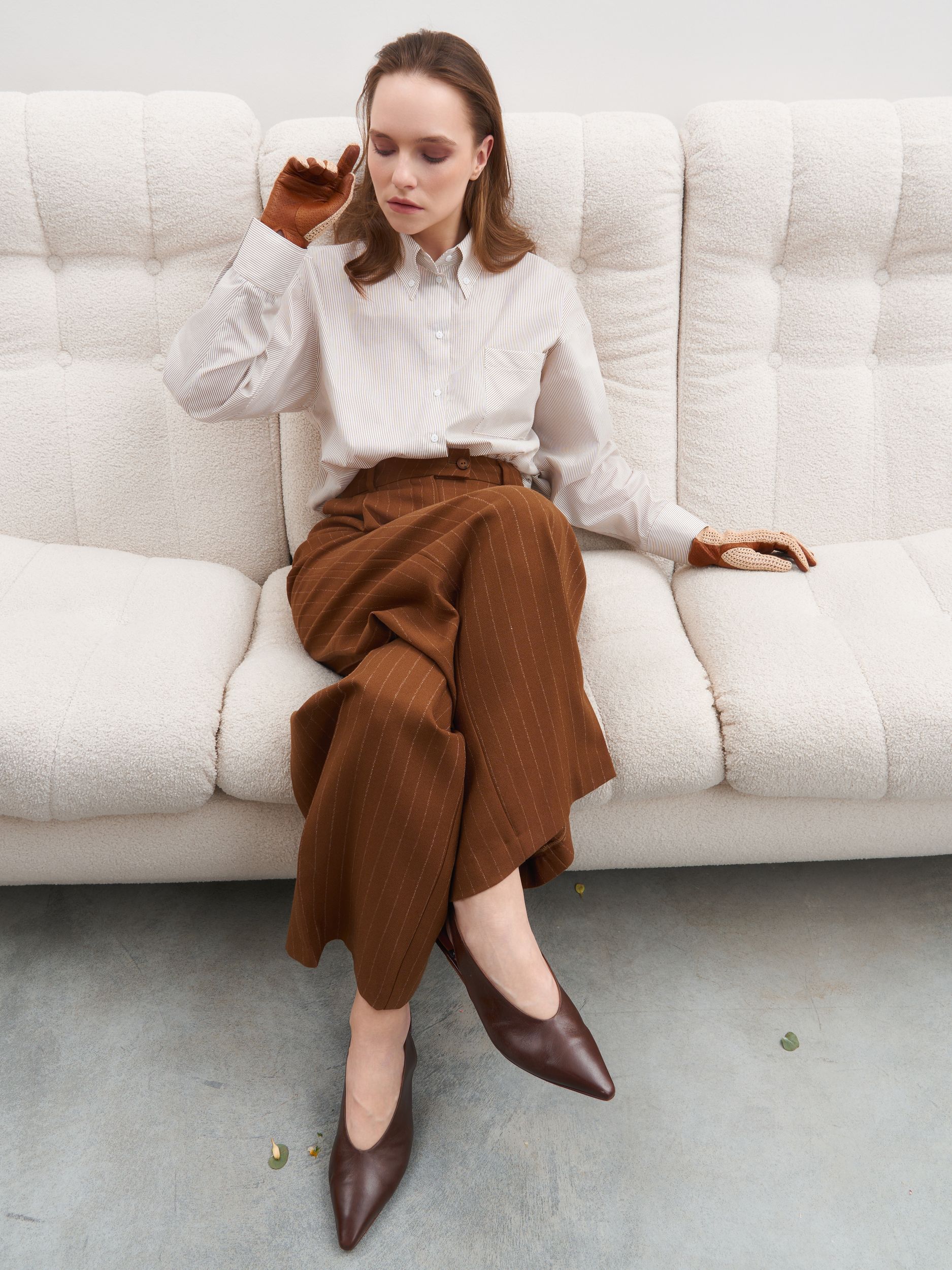 Невероятно мягкая и приятная к телу ткань обеспечивает комфорт в течение всего дня. Модель представлена в трендовой тонкой коричневой полоске, которая визуально вытягивает силуэт и делает образ более стройным и собранным.