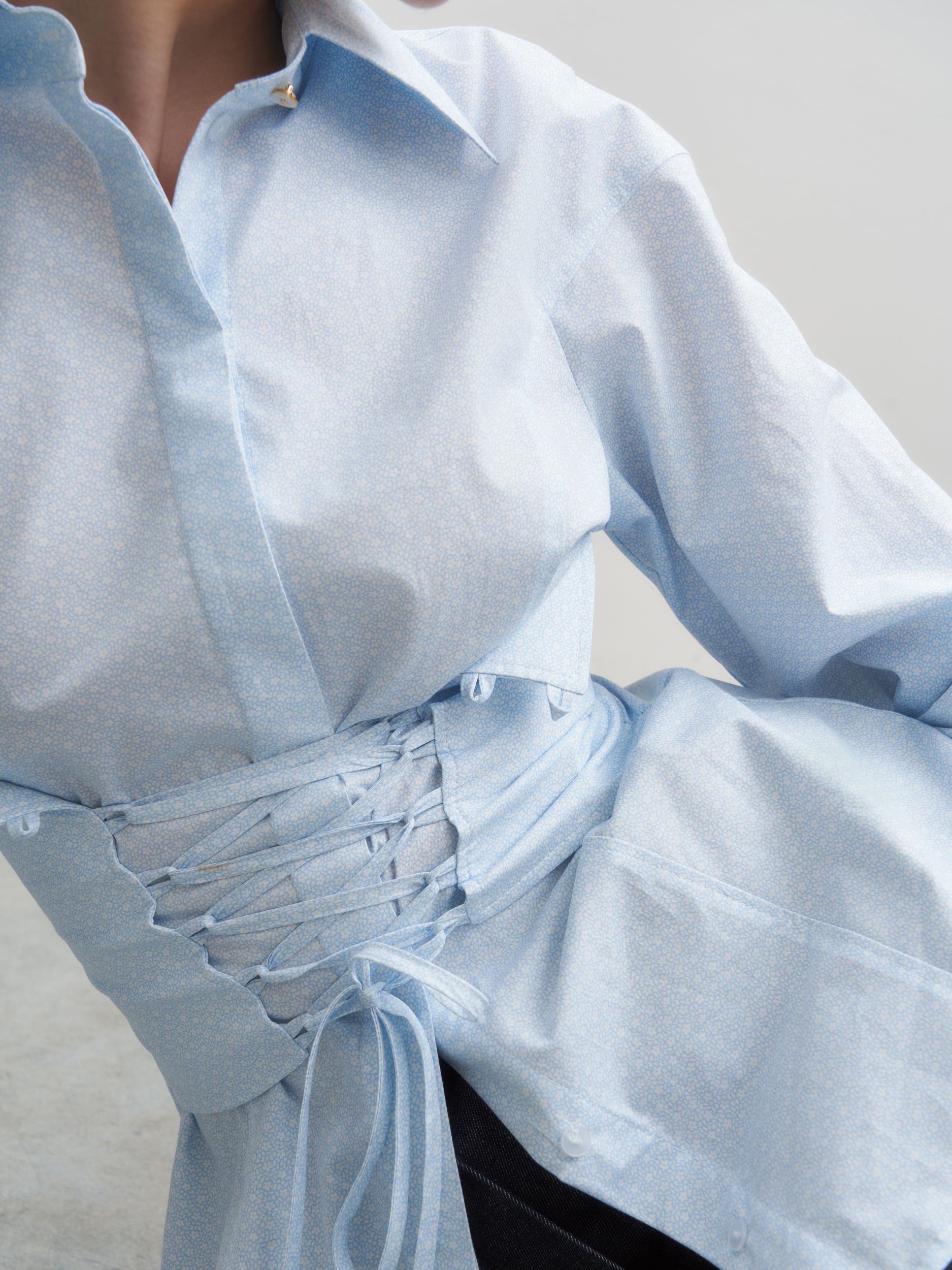 Модель выполнена из премиального итальянского хлопка. Мягко приспущенная линия плеча плавно переходит в вытачку, формируя элегантный силуэт. Главный акцент — корсет, который подчёркивает талию и позволяет менять посадку: его можно расположить как спереди, так и сзади, создавая два разных настроения образа.